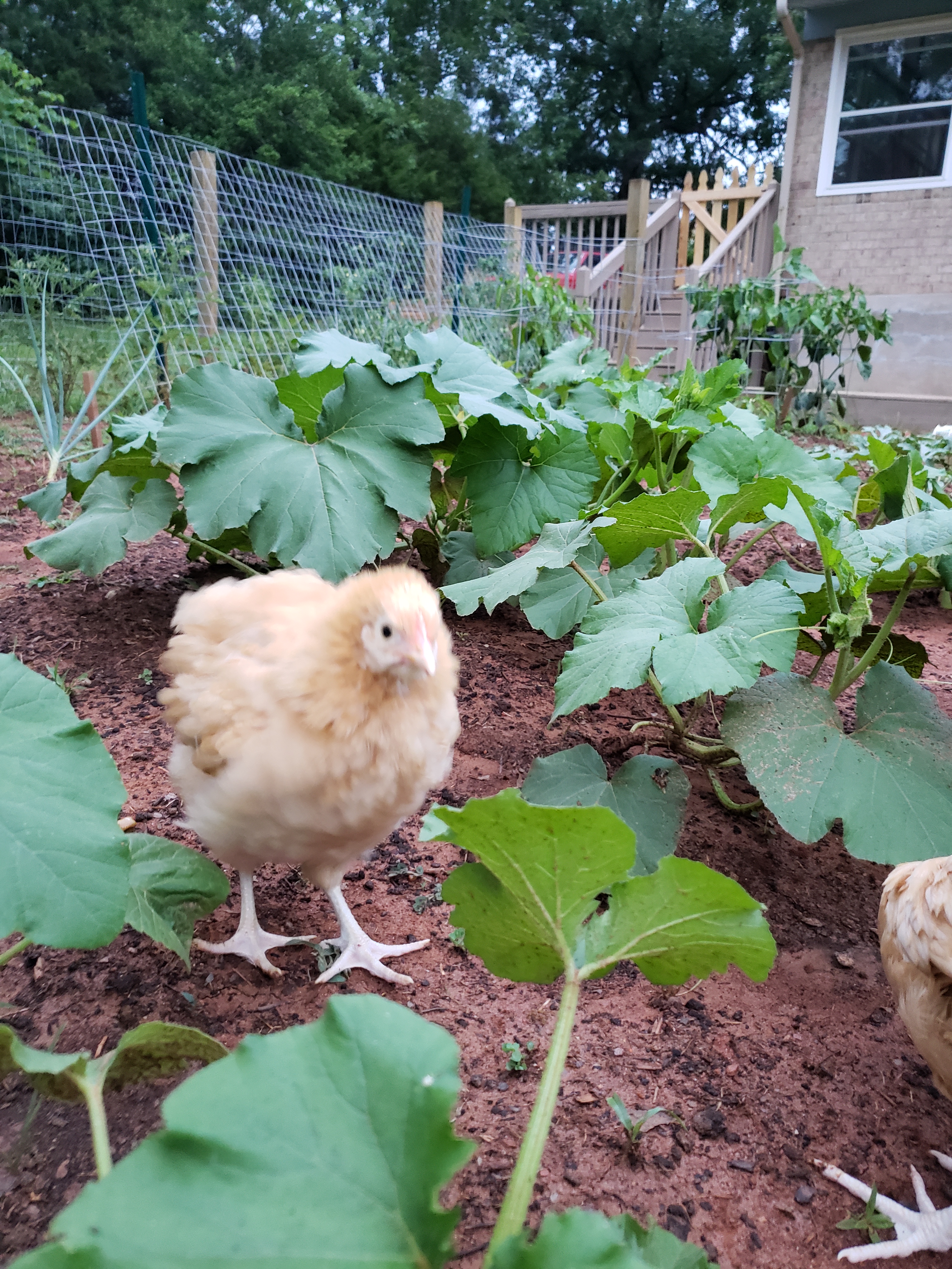By mid-July, the girls had outgrown their one Tupperware and were in two containers, four chicks each, in the future nursery. We took them outside while Spencer was building, and they helped as much as they could, standing on the drill and squawking encouragement. Their first day in the coop was my birthday party in late July, which was a way more fun party because while we had friends over, played Bocce ball and enjoyed sunshine, there were chickens running around everywhere. It was official…our descent into homesteading had begun!